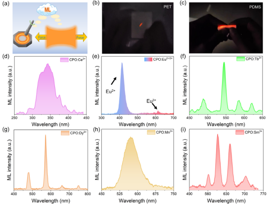 图3 a)CPO:Sm³⁺的机械致发光(ML)示意图;b)CPO:Sm³⁺在PET中的机械致发光照片;c)CPO:Sm³⁺在PDMS中的机械致发光照片;d–i)掺杂不同离子的CPO的机械致发光(ML)光谱(Ce³⁺,Eu²⁺/³⁺,Tb³⁺,Dy³⁺,Mn²⁺,Sm³⁺)。