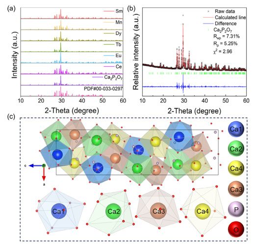 图1 a)CPO:X(X = Ce³⁺、Eu²⁺/³⁺、Tb³⁺、Dy³⁺、Mn²⁺、Sm³⁺)的XRD图谱以及CPO相的标准数据(PDF#00–033–0297);b)CPO的XRD Rietveld精修结果;c)CPO晶体结构示意图以及Ca1–Ca4与氧原子的配位多面体(Ca1为九配位,Ca2为八配位,Ca3和Ca4为七配位)。