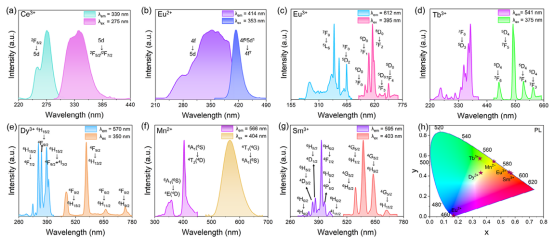 图2掺杂不同离子的CPO的光致发光(PL)光谱和色坐标图(Ce³⁺;Eu²⁺/³⁺;Tb³⁺;Dy³⁺;Mn²⁺;Sm³⁺)