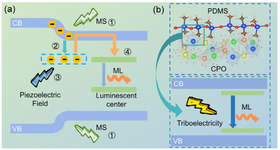 图4 a、b)CPO:X(X = Ce³⁺、Eu²⁺/³⁺、Tb³⁺、Dy³⁺、Mn²⁺、Sm³⁺)中机械致发光(ML)机理示意图(MS表示机械刺激)。
