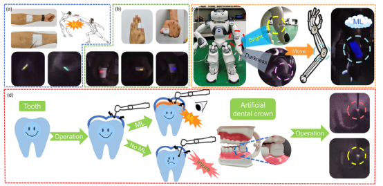图5 a)用于简单击剑比赛的计分接收装置示意图;b)附着在指关节上的可穿戴柔性“皮肤”,当指关节弯曲时会产生明亮的机械致发光(ML)信号;c)固定在机器人手臂上的人机交互装置,当机器人摆动手臂时会产生机械致发光现象;d)自制的模拟医用牙冠,在牙冠拆除过程中遇到牙钻时会产生机械致发光现象,从而帮助医生判断钻孔深度,保护牙冠下方的牙齿。