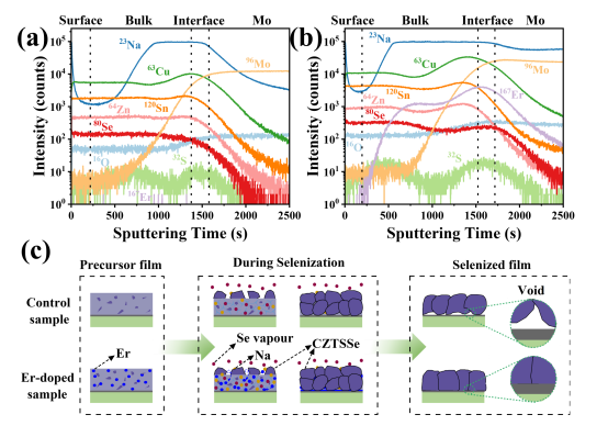 已知稀土离子通过抑制其深能级缺陷而对铜锌锡硫硒(Cu2ZnSn(S,Se)4)器件的性能产生积极影响。在此基础上,首次将铒离子(Er3+)掺杂到吸收体中,对其不利的体缺陷进行了修饰,使其具有优异的电学性能。铒的原子序数相对较大,属于重稀土元素,这种“重”的特性使得铒更倾向于积累薄膜的背面接触而不是表面,从而减少了Cu2ZnSn(S,Se)4/Mo界面的空洞,增强了准欧姆接触。这两个正效应可以帮助Cu2ZnSn4(S,Se)4器件的效率从7.3%(REr=0%)提高到10.9%(REr=0.9%)。我们的研究结果揭示了重稀土离子掺杂对改善Cu2ZnSn4(S,Se)4器件性能的令人满意的协同效果。这也为进一步推动Cu2ZnSn4(S,Se)4薄膜太阳电池的发展提供了一条新途径。