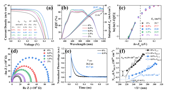 Figure 6.(a) OptimalJ-V curves, (b)EQE spectra and integratedJsc, (c) calculatedEU, and (d)EIS Nyquist plots of the different Er-doped CZTSSe devices. (e) τTPV and (f) C-V/DLCP of samples withREr = 0% andREr = 0.9%.