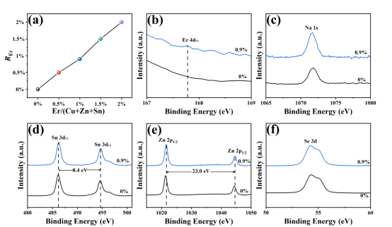 Figure 1.(a) Therelationship between Er content in films and that in the precursor solution. XPS spectra of samples withREr = 0% andREr = 0.9%. (b) Er. (c) Na. (d) Sn. (e) Zn. (f) Se.