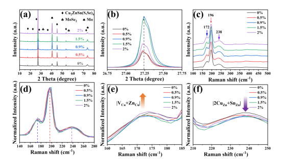 Figure3. (a)XRD patterns, (b)the enlarged (112) diffraction peaks, (c) Raman spectra, (d) the normalized Raman spectra, the amplificationregions at 172 cm-1 (e)and 234 cm-1 (f)ofthe different Er-doped CZTSSe films.