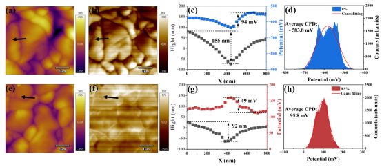 Figure 4.Surface topography, potential maps,GI and GB potential (the region indicated by the black arrow), andmean CPDvalueoffilms without and with Er-doping.(a-d)without.(e-h)with 0.9%of Er-doping.