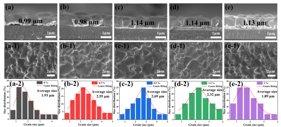 Figure 2.The SEM images and grain size distribution bar chartofthe different Er-doped CZTSSe films. (a) - (e)Cross-sectional images, (a-1) - (e-1) top-view images, and (a-2) - (e-2) grain size distributions.