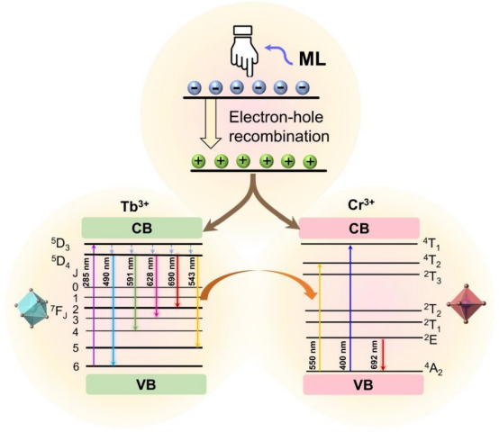 基于发光原理,机械发光材料可分为缺陷工程、压电和摩擦电控制材料三类。本研究旨在通过利用能量转移(ET)来提高光致发光(PL)和机械发光(ML)的强度。近年来,各种离子与Cr³⁺之间的ET已被证明可以增强PL性能。基于这一背景,本研究合成了Tb₃Al₅O₁₂:Cr³⁺,并观察到Tb³⁺的5D₄→⁷F₅跃迁与Cr³⁺的⁴A₂→⁴T₂跃迁之间的ET现象。