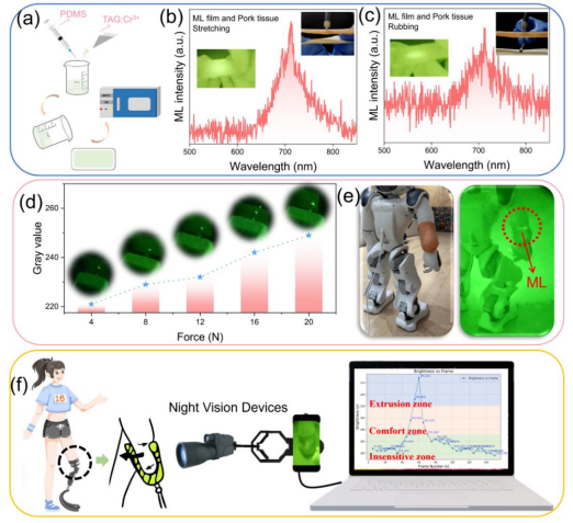图5、(a) TAG:Cr³⁺/PDMS制备过程;(b)拉伸下猪肉组织0.7 cm穿透的应力发光光谱和(c)摩擦下的应力发光;(d)力随应力发光强度的灰度值检测;(e)覆盖在机械臂上的TAG/PDMS包覆层穿透观察应力发光;(f)假肢舒适度测试系统;