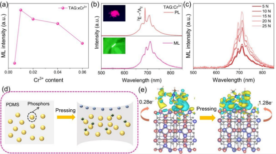 图4、(a)不同Cr³⁺浓度下TAG:x Cr³⁺的ML强度;(b) PL和ML光谱的比较;(c) TAG:Cr³⁺/PDMS弹性体在不同载荷(5、10、15、20和25 N)下的ML光谱;(d) ML现象的潜在机制;(e)摩擦电诱导ML机制的模型以及接触表面的TAG-PDMS的三维电荷密度差异和Bader净电荷;