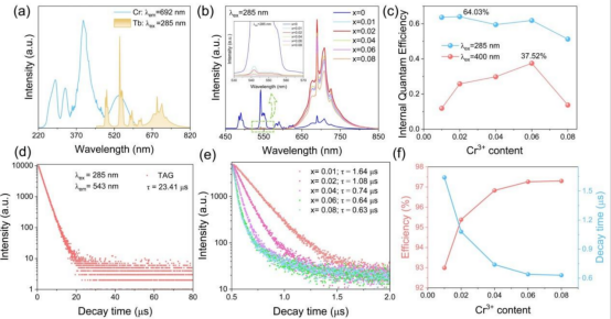 图3、(a) TAG:Cr³⁺的PLE光谱和TAG的PL光谱;(b) TAG:x Cr³⁺的PL光谱;(c) TAG:x Cr³⁺在285 nm和400 nm激发下的量子效率;(d) TAG和(e) TAG:x Cr³⁺化合物的PL衰减曲线(激发波长为285 nm,监测波长为543 nm);(f) TAG:x Cr³⁺的寿命与能量转移关系;