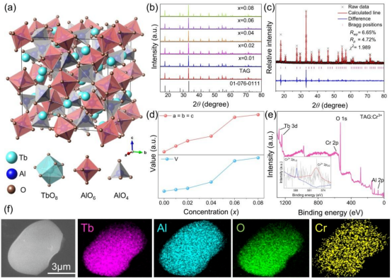 图2、(a) TAG的晶体结构图;(b) TAG:x Cr³⁺ (x =0.01, 0.02, 0.04, 0.06, 0.08)的XRD图谱及TAG的标准图谱(PDF#01-076-0111);(c) TAG的粉末XRD谱图的Rietveld精修;(d) TAG:x Cr³⁺ (x =0.01, 0.02, 0.04, 0.06, 0.08)的精修晶格参数;(e) TAG:x Cr³⁺的XPS谱图;(f) TAG:0.02Cr³⁺样品中Tb、Al、O、Cr的元素映射图像